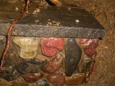 五色玉石のアーチ橋の入口には「聴泉窟」と書かれ、中は土砂で埋められていましたが、調査堀りの結果、左右にインド様式の柱と五色玉石のベンチが発見されました。揚輝荘にはこの意匠で造られた橋、藤棚などが多く、このアーチ橋「聴泉窟」も貴重な遺産として保存されることになりました。